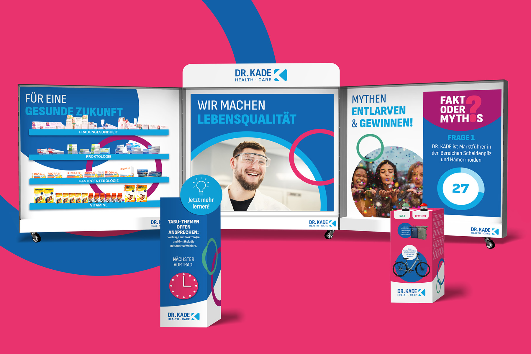 Das neue Corporate Design wurde konsequent in ein ganzheitliches Markenerlebnis übersetzt. Der Startschuss fiel intern: Mit einem umfangreichen Brandbook, hochwertigen Business-Assets und einem emotionalen Kick-off-Package wurden die Mitarbeitenden von DR. KADE aktiv in den Relaunch eingebunden. Parallel dazu erfolgte die Weiterentwicklung des digitalen Auftritts inklusive der Konzeption einer neuen Corporate Website. Ein starker Fokus lag dabei auf dem Employer Branding, um das Unternehmen als modernen, sinnstiftenden Arbeitgeber zu positionieren. Das besondere Highlight des externen Roll-outs: Auf einer deutschlandweiten Apothekentour wird die Marke DR. KADE für Healthcare Professionals durch ein offenes, im neuen Look & Feel gestaltetes Standkonzept persönlich erlebbar.